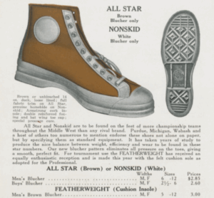 Inventado em 1891 na vizinha Springfield, Massachusetts, o basquete estava crescendo em popularidade e sendo adotado por faculdades regionais quando a Converse lançou seu tênis “Non-Skid” em 1917, definindo o design como o “All-American Basketball-Ball Shoe“. Ele foi criado com base na forma original do sapato social da empresa, com um quarto de duas peças para um ajuste superior no tornozelo e combinado com uma sola antiderrapante que empregava o padrão de diamante patenteado da Converse.